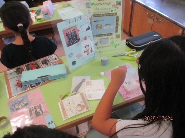 自分で持ってきた思い出の写真や絵などを工夫して貼り付けてラミネートしました。