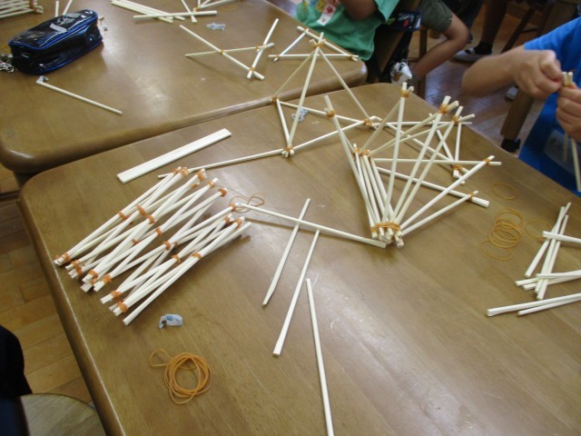 割りばしと輪ゴムを使って立体作品の制作に取り組んでいました。