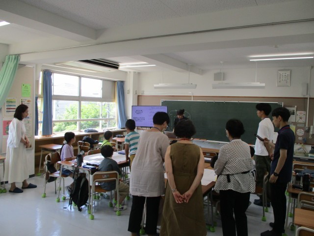 2階の教室では、弦巻小学校が災害時、避難所になったときどうするかという想定で避難所運営ゲーム(HUG)を行いました。けがをしている人、病気の人、けがをしていない元気な人、を教室にどのように案内するか、みんなで相談しながらゲームを通して学びました。