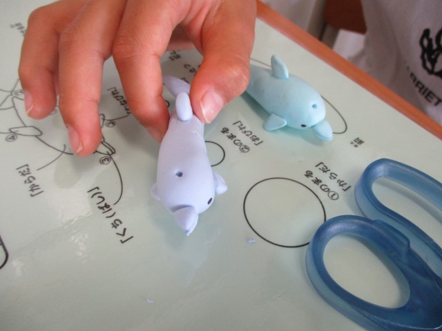 2階の教室では、国際イルカ・クジラ研究リサーチセンターの方を講師に、イルカの形やからだの仕組み、生活についてお話を聞きました。イルカの特徴を聞きながら、粘土をつかってイルカを作りました。