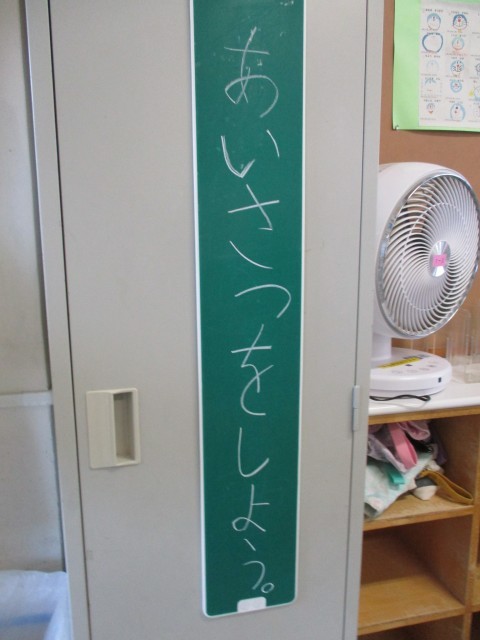 今週は、2学期始めの週ということで「あいさつをしよう」という目標になりました。各教室で先生や児童が今週のめあてを小さな黒板に書いています。