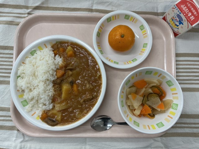 ポークカレーライス 福神漬け風サラダ 冷凍みかん 牛乳