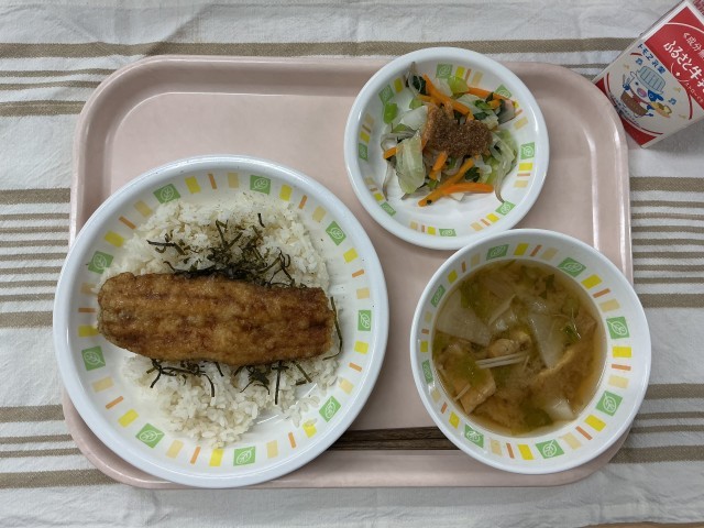 秋刀魚のかば焼き丼 かぶのみそ汁 ごま和え 牛乳