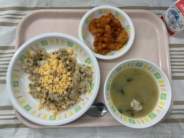 たまごチャーハン イカと大豆のチリソース 中華風コーンスープ 牛乳