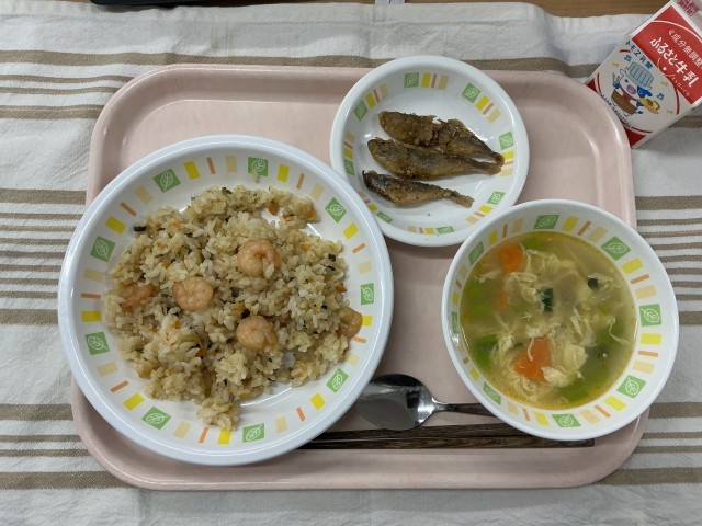 エビチャーハン 豆アジのから揚げ 中華風たまごスープ 牛乳