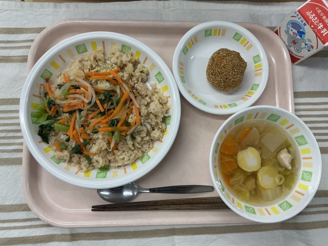二色そぼろごはん すまし汁 さつま芋のごま団子 牛乳