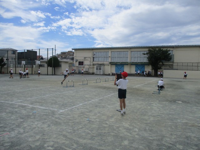 タブレット端末で自分のハードルを跳ぶ様子を録画してもらい、学習を進めていました。