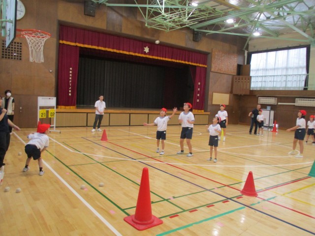 チームに分かれて玉入れの球を投げるゲーム運動を行っていました。