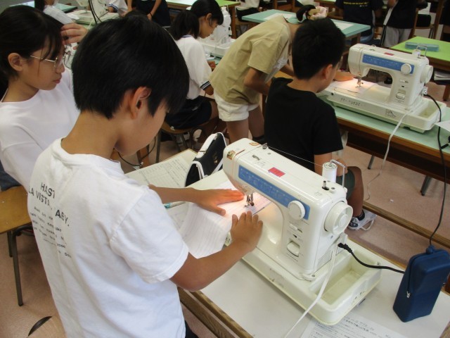 二人一組になって、一人がミシンを使って縫い、もう一人がチェックリストを参考に縫い方がどうか確認しています。