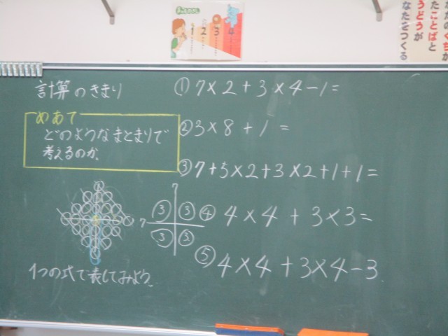 計算のきまりという単元で、今日は示された〇の数を計算するために、どのような式を立てたらよいか、考える授業をしていました。
