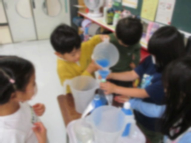 1年生の教室では算数では「どちらがおおい」という単元で、身の回りにあるものの体積について学習していました。