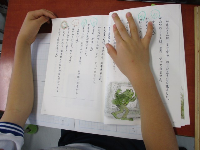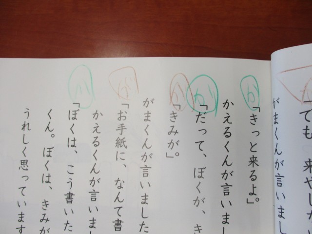 子どもたちが読んでいる教科書をのぞき込むと、茶色の「が」と緑の「か」と書き込みがあります。登場人物どちらの言葉なのか考えて読んでいました。