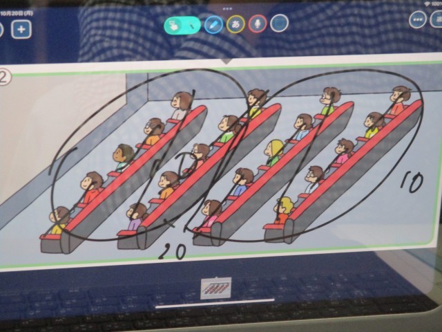 2枚のスライドを見て、どちらの方が数えやすいか考えることからスタートします。かけ算のよさや特徴を考えながら学習を進めていました。
