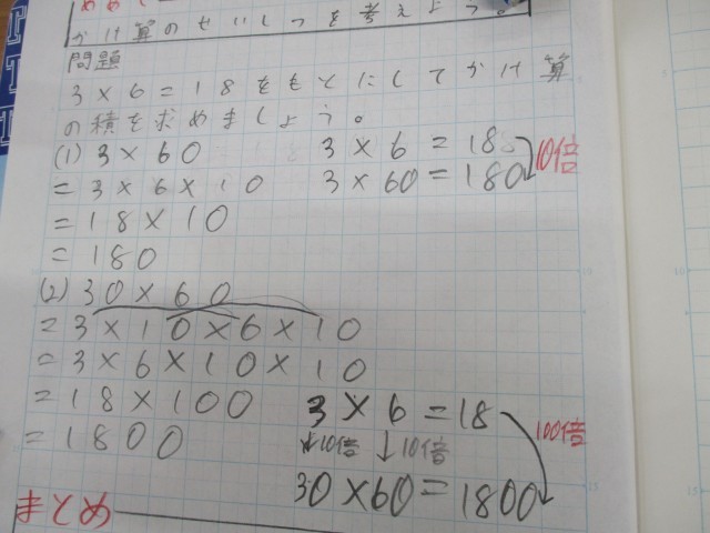 今日は3×6=18ということを使って、3×60や30×60をどう求めるか考えていました。