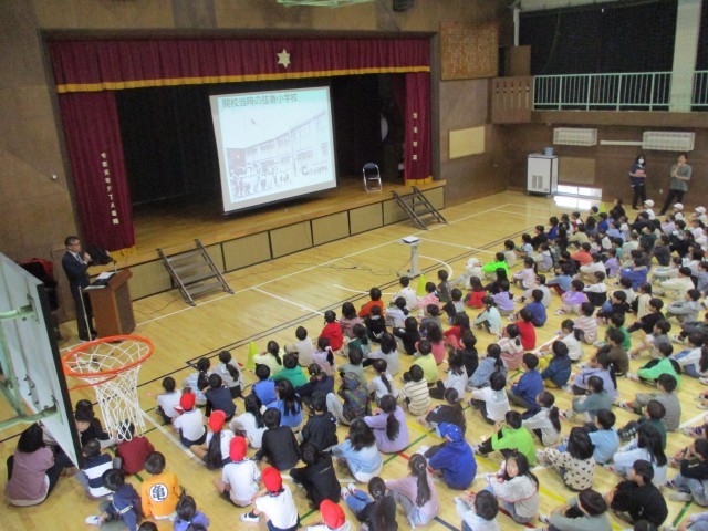 最初に校長先生から、83年前の社会の様子や学校の開校当時の様子についてお話を聞きました。