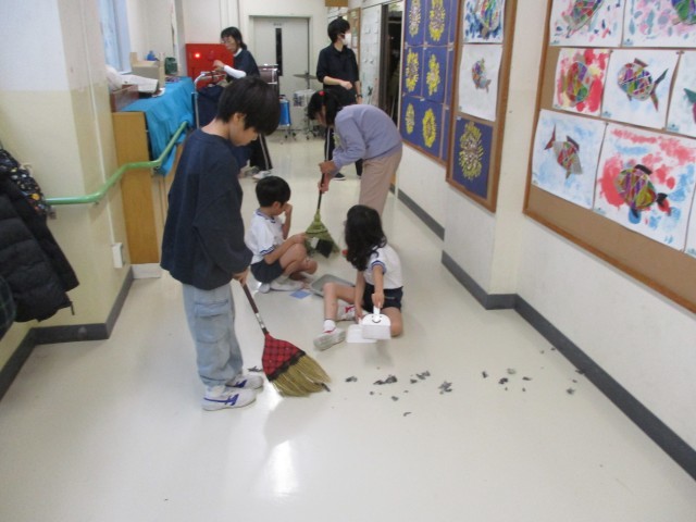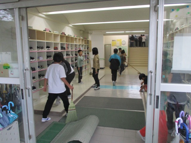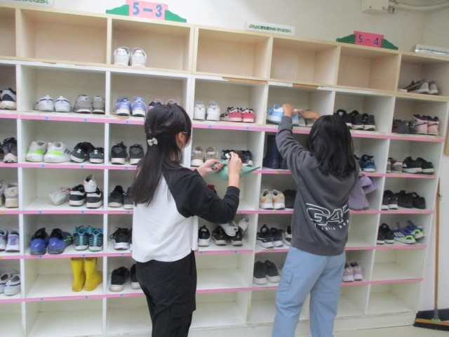 弦巻小学校では、校庭の混雑緩和のため、昼休みと掃除の時間を低学年と高学年で入れ替えて設定しています。