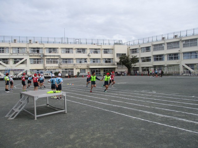 朝の始業前の時間、6年生の代表選抜リレーの練習が校庭で行われていました。