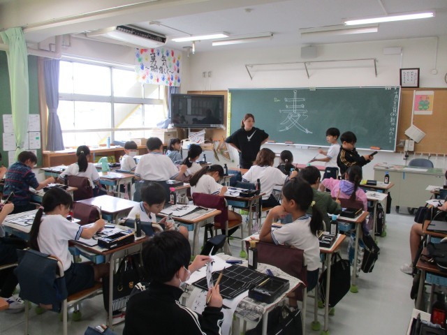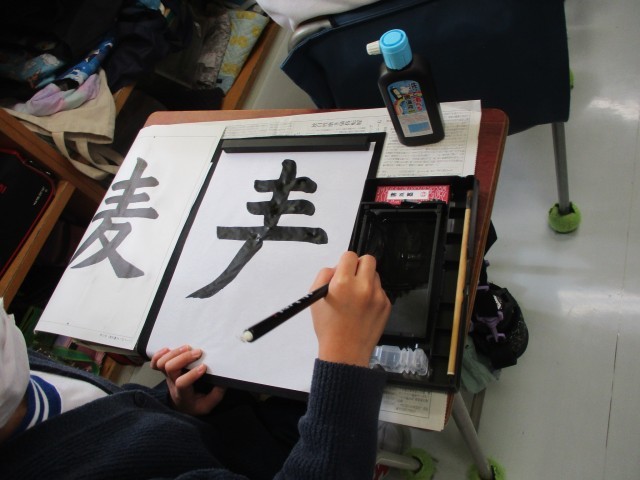 「麦」という文字の「とめ」「はらい」など、ポイントを全体で確認した後、、みんな丁寧に書いていました。