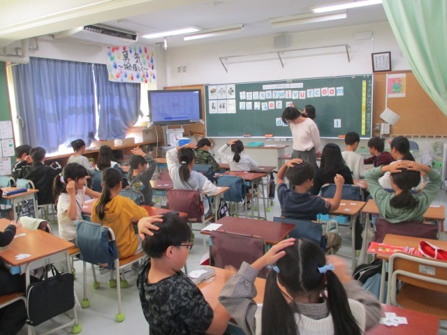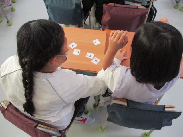 4年生は外国語活動でアルファベットの小文字に親しむ学習活動を行っていました。ALTの先生が話すアルファベットを聞いて、隣の友達とかるたのように取り合います。pとq、mとnなど、間違いやすいアルファベットも楽しみながら学習しています。