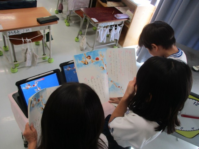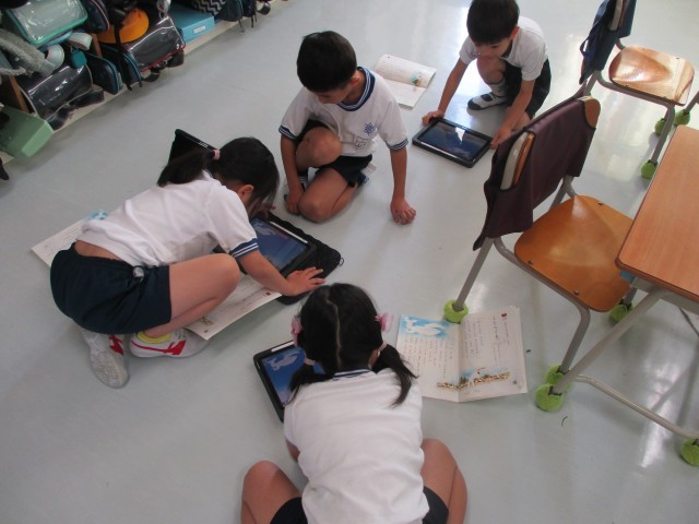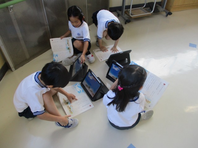 4時間目の国語の学習では、タブレット端末を使い、取り込んだ教科書の挿絵に自分たちの朗読を録音する活動を行っていました。