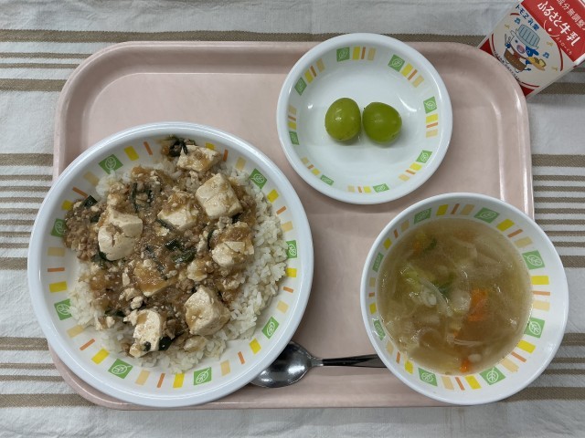 麻婆豆腐丼 ピリ辛中華スープ シャインマスカット 牛乳