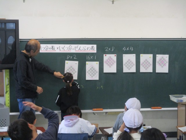一つ分の数×いくつ分で全部の数がわかる、というかけ算の特徴を確認し、16個の〇が書かれた画像をどのようにかけ算で表すか考えていました。