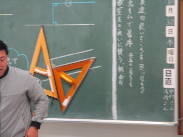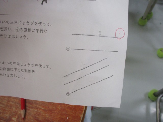 今日は昨日の学習を足掛かりに、2つの三角定規で垂直を作り、片方を下に移動させると平行ができるということに気付き、実際に平行線を書いて確かめました。