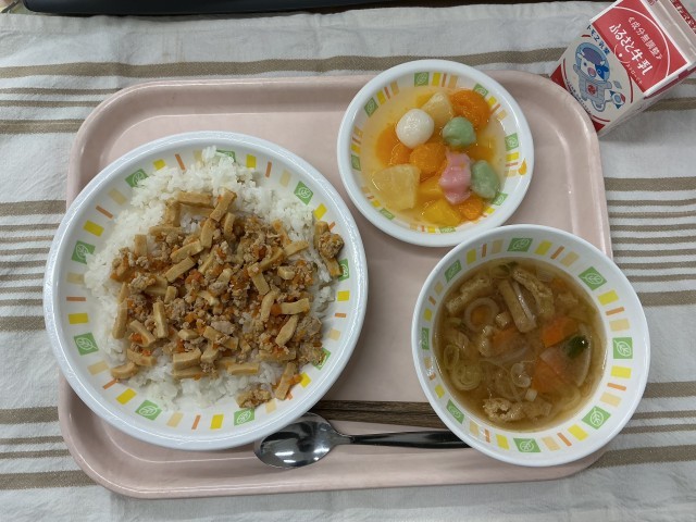 高野豆腐のそぼろ丼 ねぎと油揚げのみそ汁 フルーツ白玉 牛乳
