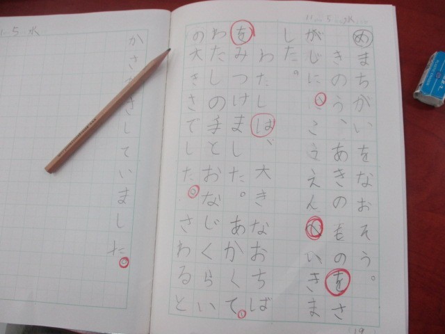 教師が間違えにしるしをつけて正しい文字をていねいに確認しました。
