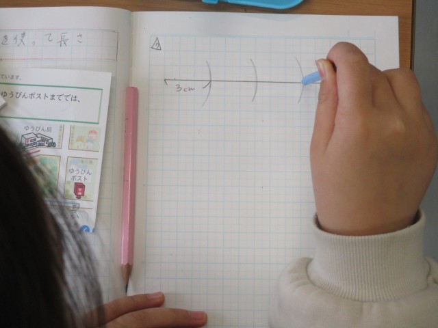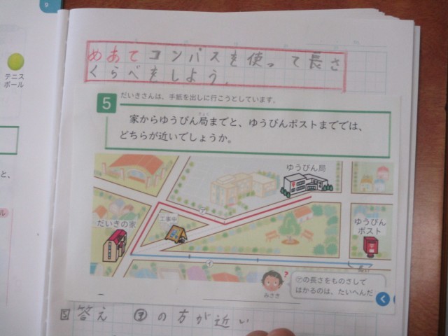 今日は円を書くのではなく、長さを測る・長さを比べる、ということでコンパスを使って学習をしていました。