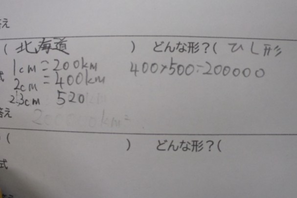 「北海道はひし形の形で、地図の1cmが200kmだから…」と今まで学習したことを使いながら、おおよその面積を求めていました。