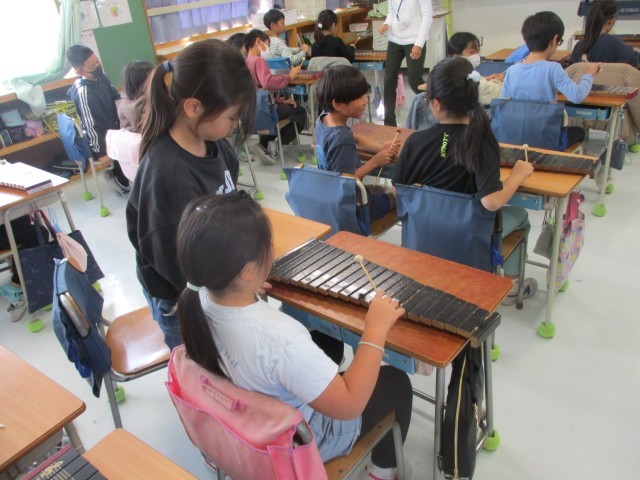 マレット(ばち)の持ち方や音板のたたく場所・たたき方など、一つ一つ友達と確認しながら演奏していました。