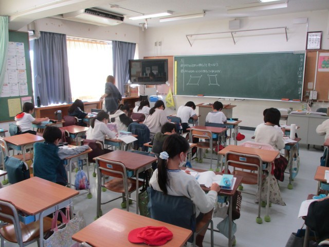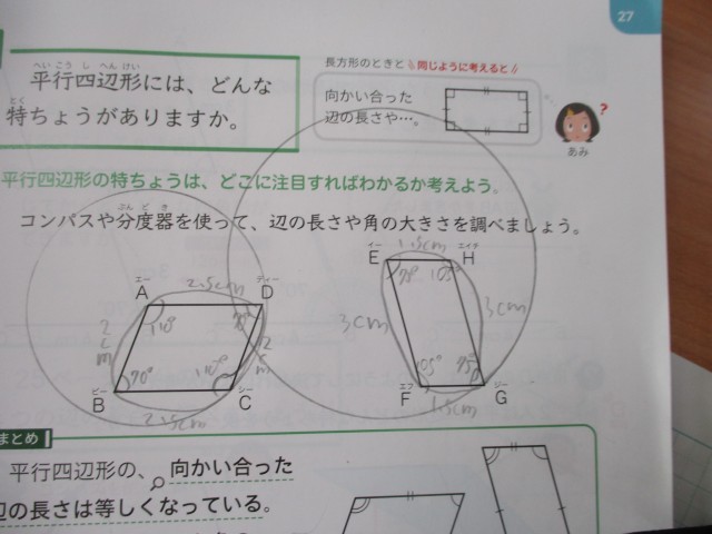 平行四辺形のそれぞれの辺の長さや、角度などを定規や分度器を使い測り特徴を探していきます。「この辺とこの辺の長さはいつも同じだ」とか「向かい合う角度も同じだ」など、実際に測りながら特徴を発見していました。