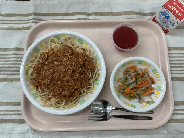 スパゲッティみそミートソース もやしのサラダ ぶどうゼリー 牛乳
