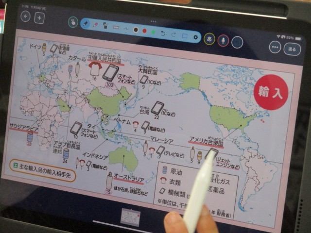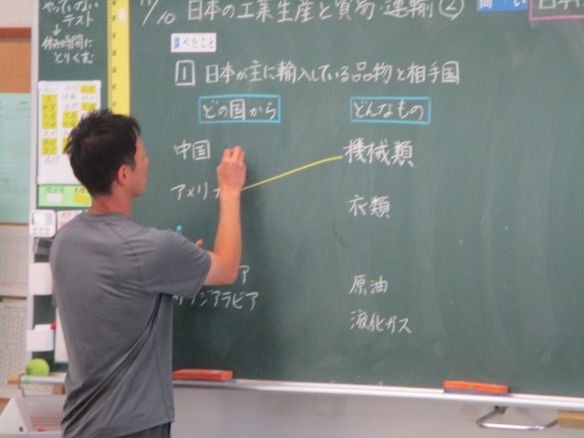 5年生の教室では、日本の工業生産と貿易・運輸について学習していました。