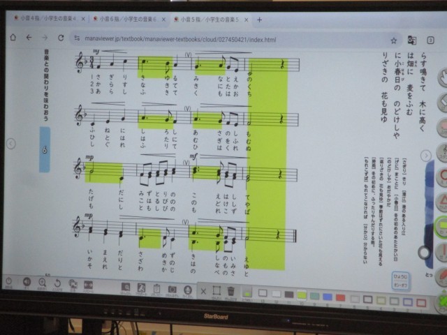音楽室では、5年生が「詩と音楽との関わりを味わおう」という題材の学習をしていました。