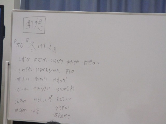 今日は「冬げしき」という曲を聴き、曲想を発表し合い、音楽のどのような要素からその曲想が生まれているか考えていました。「旋律がなだらかに上がって下がるから静かな感じがする」など、音楽の特徴をつかんで自分の考えを発表していました。