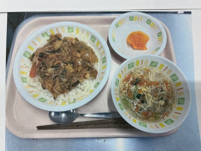 キムチ丼 かきたま春雨スープ 柿 牛乳
