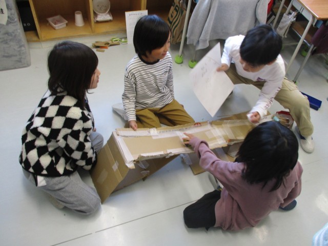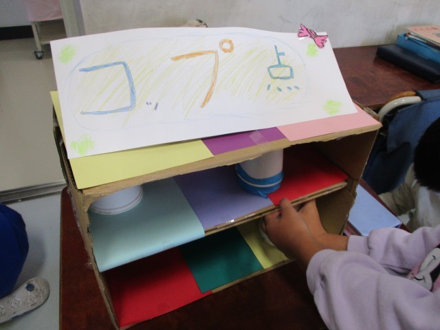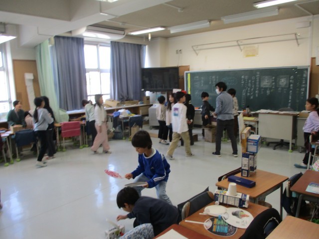2年生は「あそんで ためして くふうして」という単元で生活科の学習を行っています。動くおもちゃづくりに取り組み、今日は教室でつくったおもちゃを使って活動しました。
