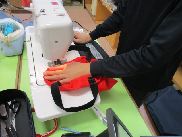 自分で選んだ布地でバッグをつくります。まち針で留めてミシンで縫っていきます。持ち手の取り付けまで進んでいる児童もいました。