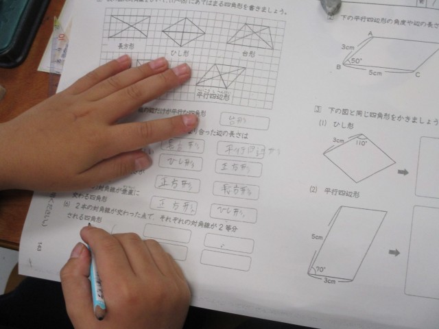 4年生の垂直、平行と四角形の算数の学習も単元の終わりが近づいてきました。