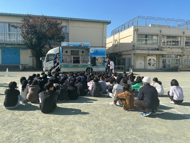 避難訓練で、6年生(1組,3組,4組,六組)の代表児童が起震車に乗って震度7の地震を体験しました。