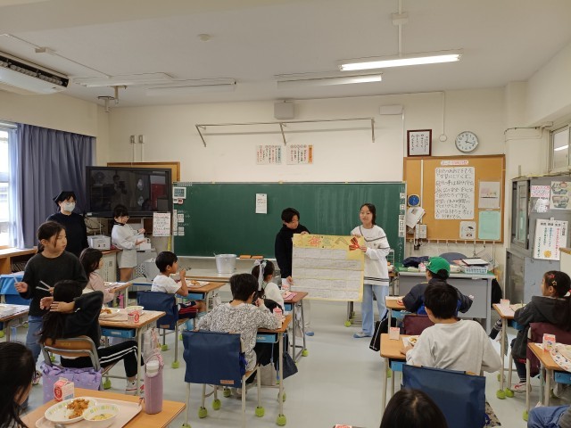給食の時間には5年生が3年生の教室にメッセージを届けに来てくれました。「鳴子がそろっていてすごかった」「動きがかっこよかった」など、5年生の言葉を嬉しそうに聞いていました。