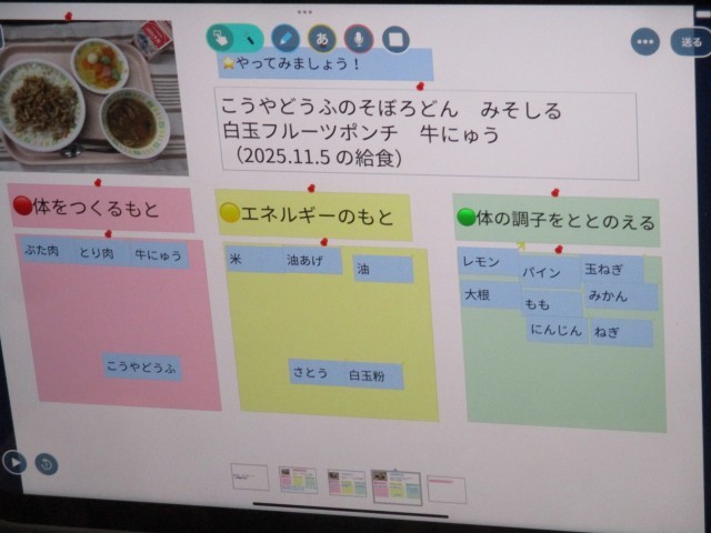 「けんこうな生活~食べて元気!~」という単元で、食べ物が体の中で「体をつくもとになるもの」「エネルギーのもとになるもの」「体の調子を整えるもの」の3つに分けられること、そしてまんべんなく食べることの大切さについて学習しました。