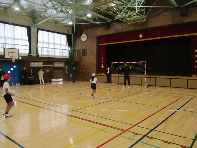 3年生はハンドボールの選手を学校に来ていただき、ハンドボールの体験をしました。