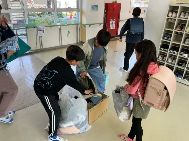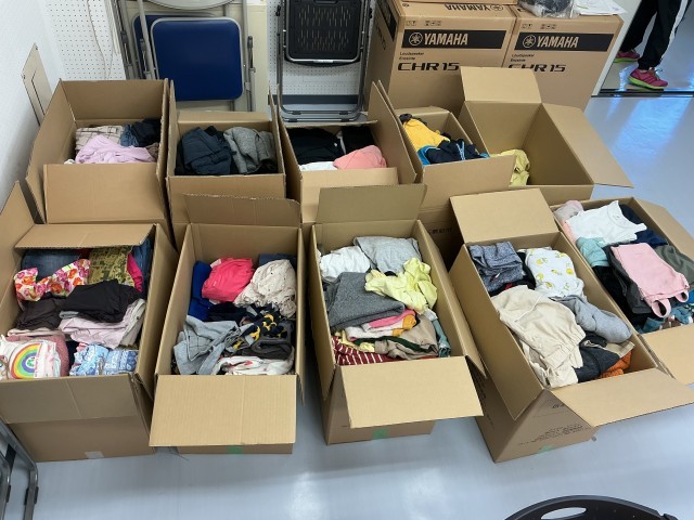 使わなくなった服を集め、難民の方に届けるため11月に全校に呼びかけ服の回収を行いました。たくさんの方にご協力いただき、大きな段ボール10箱分の服を回収することができました。