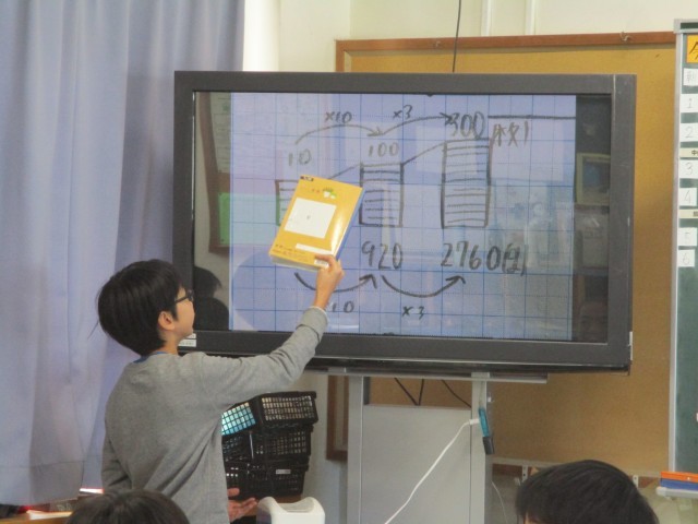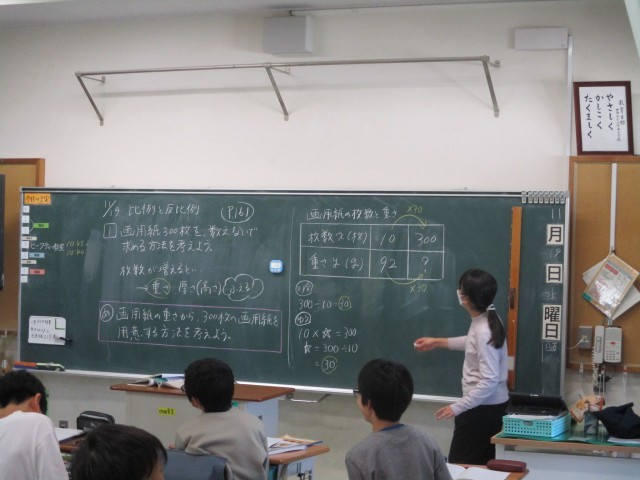比例と反比例の学習で、10枚で92gの画用紙が300枚あった時の重さについて、それぞれ自分の考えをまとめたり、友達の考えを聞いたりしました。