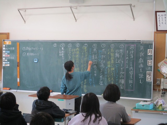 6年生の教室で国語で『鳥獣戯画』を読む という文章を読み、段落ごとにどのような内容が書かれているか、短い文章でまとめる学習をしていました。