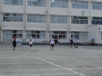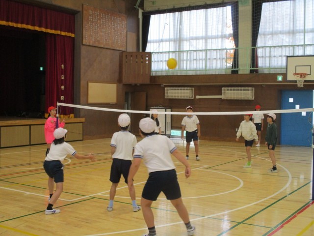 5年生は1組が校庭の砂場で走り幅跳び、2組がティーボール、3組が体育館でキャッチバレーボールの学習とそれぞれ体育の学習をしていました。どのクラスも励ましの言葉やアドバイスなど、お互いに声を掛け合いながら、学習に取り組んでいます。