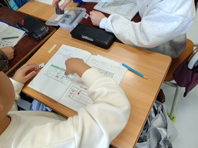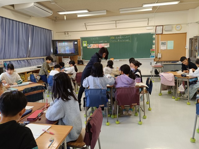 今日は、同じ体積の場合、ものの種類によって重さが違うのか、ということについて学習をしていました。同じ体積の鉄、アルミニウム、プラスティック、木の4種類のブロックを実際に持ってみたり、電子ばかりで計ってみたりしながら、グループで協力して学習を進めていました。